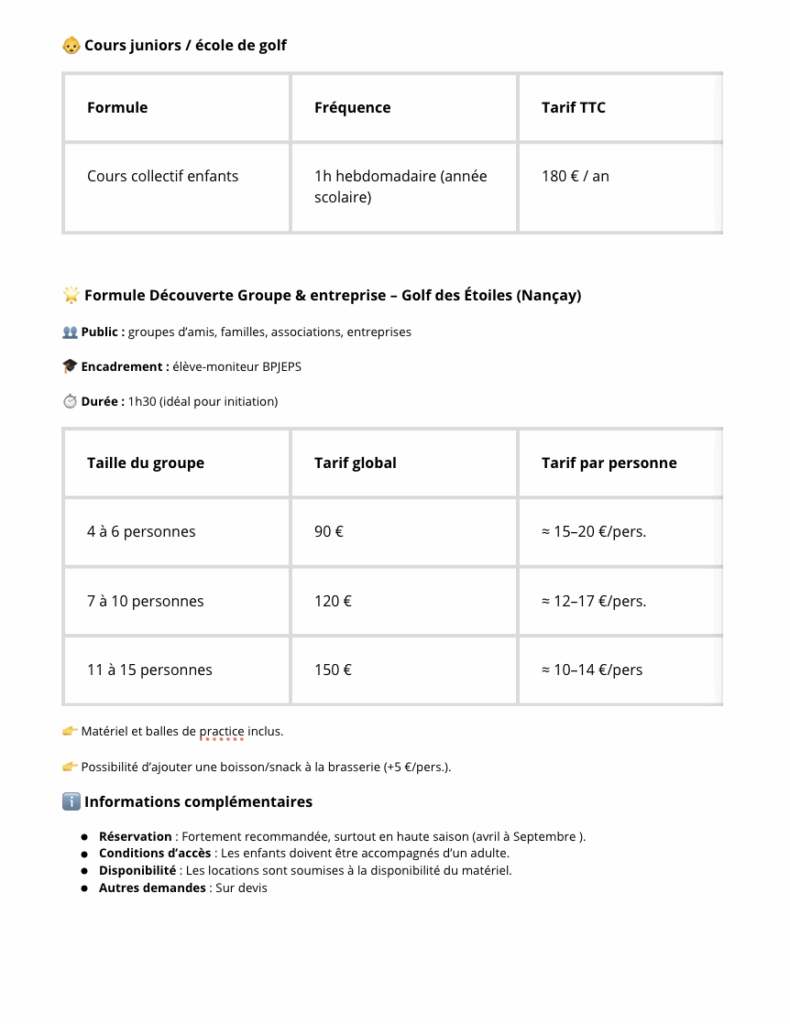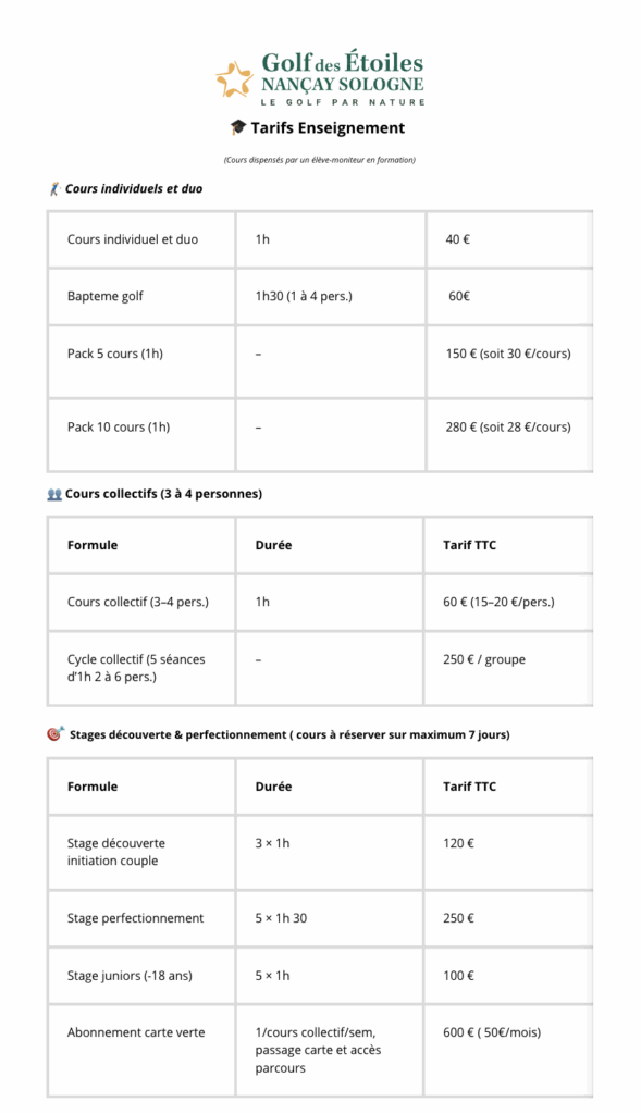 Le Golf des Etoiles Nancay Sologne peut proposer des enseignements avec un professeur de golf déterminé à vous transmettre ses meilleurs conseils pour améliorer votre swing, que vous soyez débutant ou déjà expérimenté. Participez à des leçons individuelles et collectives, mais aussi à des stages et Pro-AM. Votre enfant est le bienvenu, enfants à partir de 7 ans.