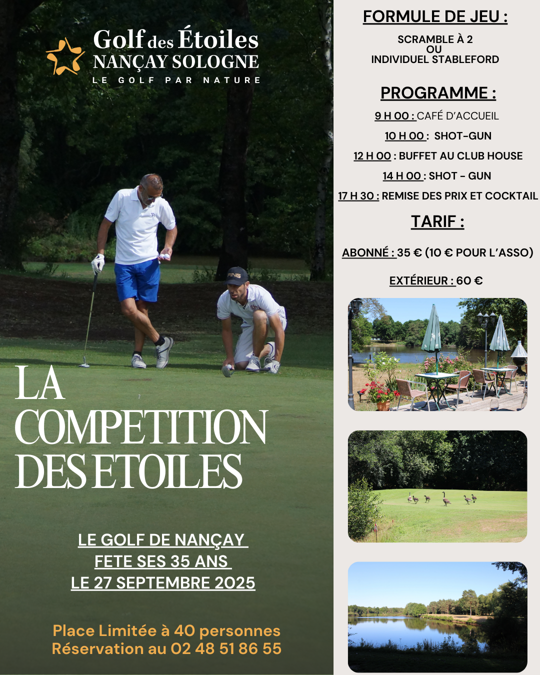 La Compétition des Étoiles , qui se tiendra le samedi 27 septembre 2025 . Un moment sportif, convivial et festif à ne pas manquer ! 🏌️‍♂️ Formule de jeu au choix :Scramble à 2  OUStableford individuel 📅 Programme de la journée : 9h00 : Café d’accueil – 10h00 : Départ Shot-Gun (1ère partie)12h00 : Buffet convivial au Club House – 14h00 : Shot-Gun (2e partie) – 17h30 : Remise des prix & Cocktail 💰 Tarif de participation : Abonné : 35 € (dont 10 € pour l’association) – Extérieur : 60 € 📌 Informations pratiques : 📍 Golf de Nançay – Sologne  ⚠️ Places limitées à 40 personnes